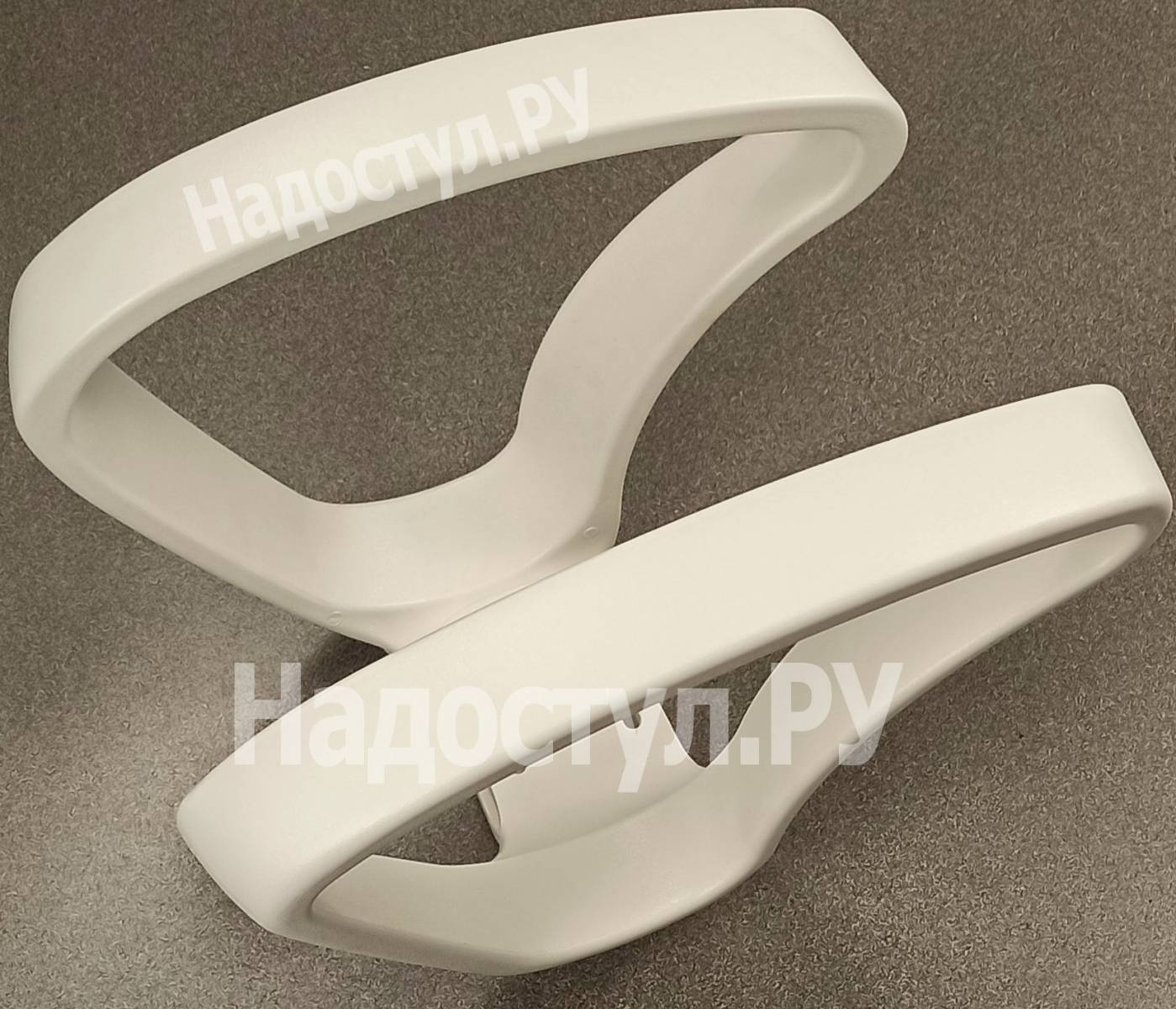 Пара белых каплевидных пластиковых подлокотников для офисного кресла.